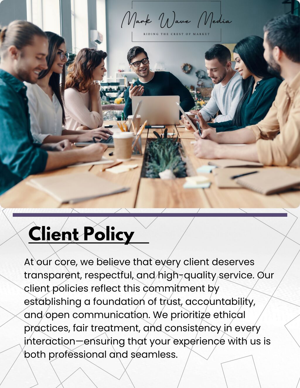 Welcome to our Policies page. Here, we outline the essential guidelines and standards that govern how we interact with our clients and manage our employees. These policies ensure transparency, trust, and a professional relationship with all stakeholders.